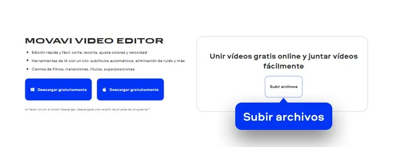 Cuando quiero hacer algo rápido, normalmente empiezo con una herramienta web. Movavi tiene un práctico unidor que funciona directamente en el navegador. Es una opción muy cómoda si necesito unir dos vídeos en pocos minutos.