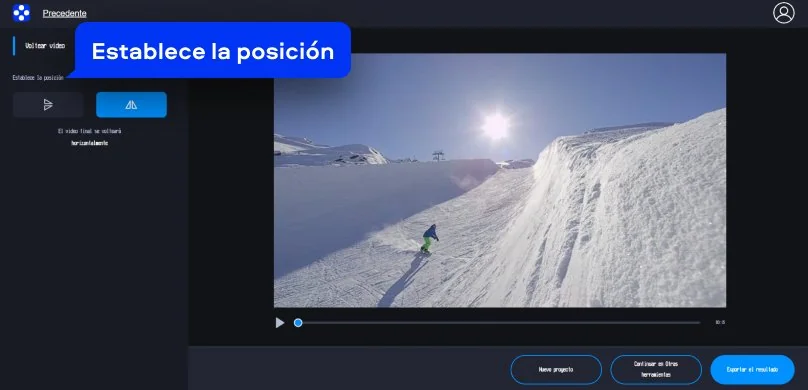 Aquí puedes establecer la posición del video según lo necesites en cada caso. El video final volteará horizontalmente y/o verticalmente, así que puedes aplicar opciones como voltear video horizontal o voltear video vertical fácilmente.