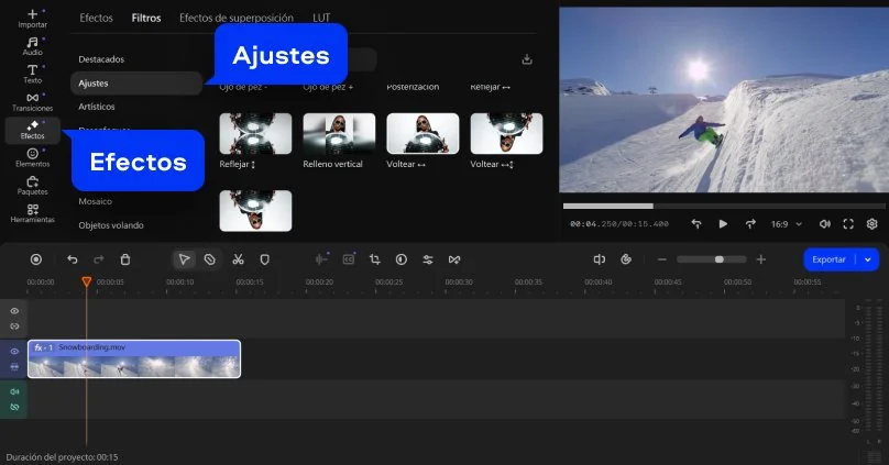 En el panel izquierdo, selecciona Efectos > Filtros > Ajustes. Dentro de esta categoría encontrarás la opción Voltear (flip video), que te permite aplicar el efecto de inversión al vídeo con un solo movimiento, sin necesidad de ajustes adicionales.