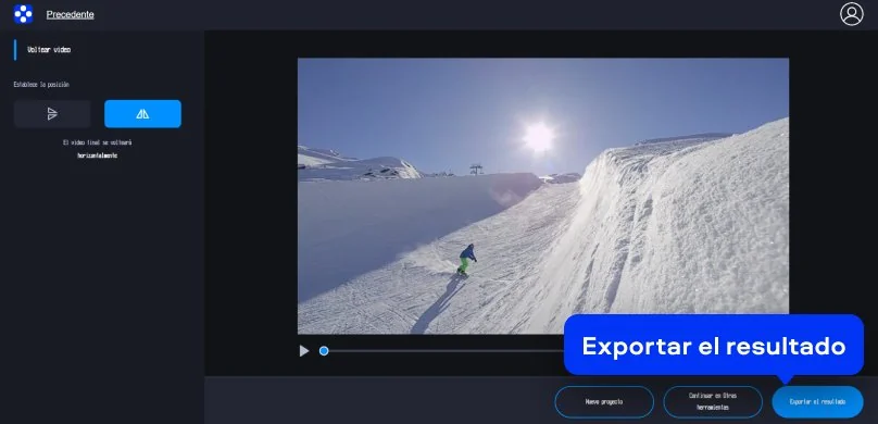 Revisa el resultado en la ventana de vista previa. Si el efecto está correcto, haz clic en Exportar, elige el formato, la calidad y la carpeta de destino, y guarda tu vídeo volteado.