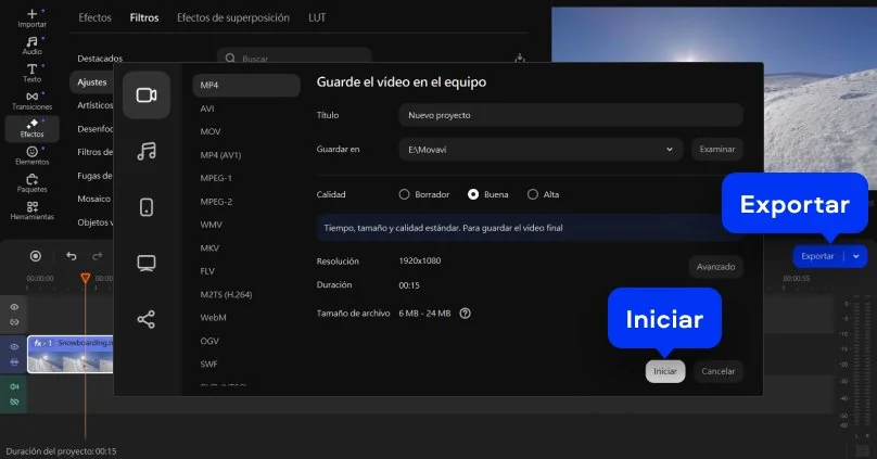 *La versión gratuita de Movavi Video Editor podría tener las restricciones siguientes en función de la compilación: marca de agua en los clips exportados, límite de 60 segundos en el vídeo o del 1/2 en el audio, o algunas características avanzadas no disponibles al exportar vídeos.