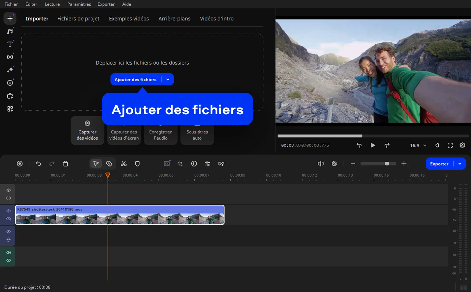Ajoutez votre fichier vidéo en cliquant sur Ajouter des fichiers ou par glisser-déposer. La vidéo apparaît dans la bibliothèque et peut être placée sur la timeline pour commencer les ajustements.