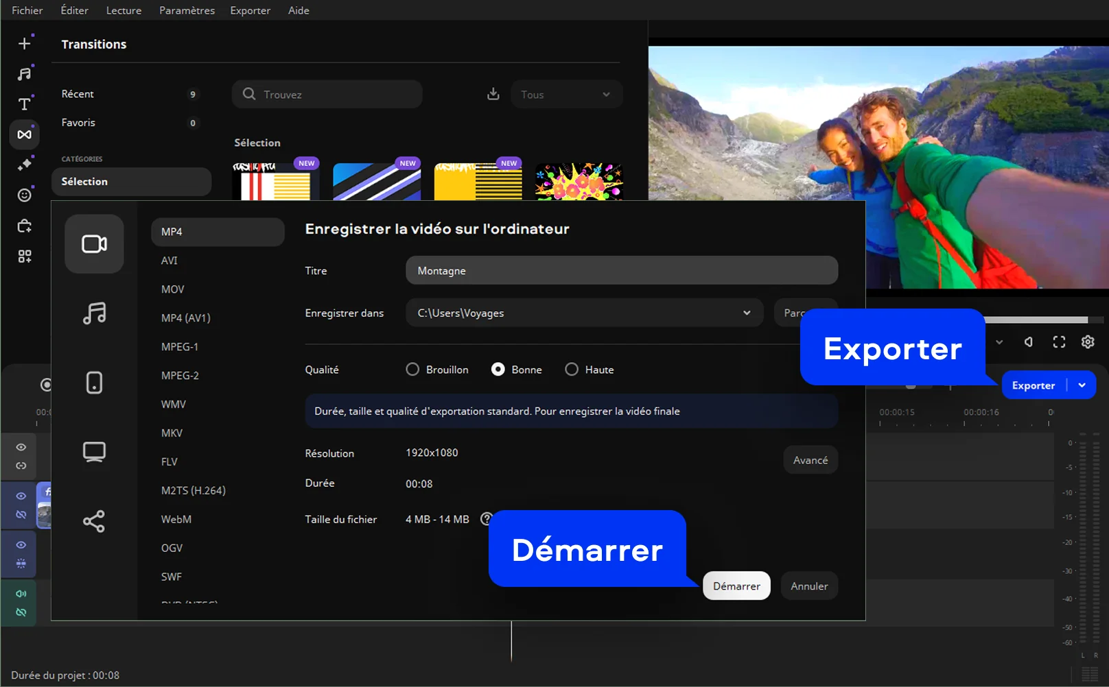 Visionnez le résultat final dans le lecteur intégré pour vérifier les améliorations. Une fois satisfait, cliquez sur Exporter, choisissez le format souhaité et enregistrez la vidéo optimisée en cliquant sur Démarrer.