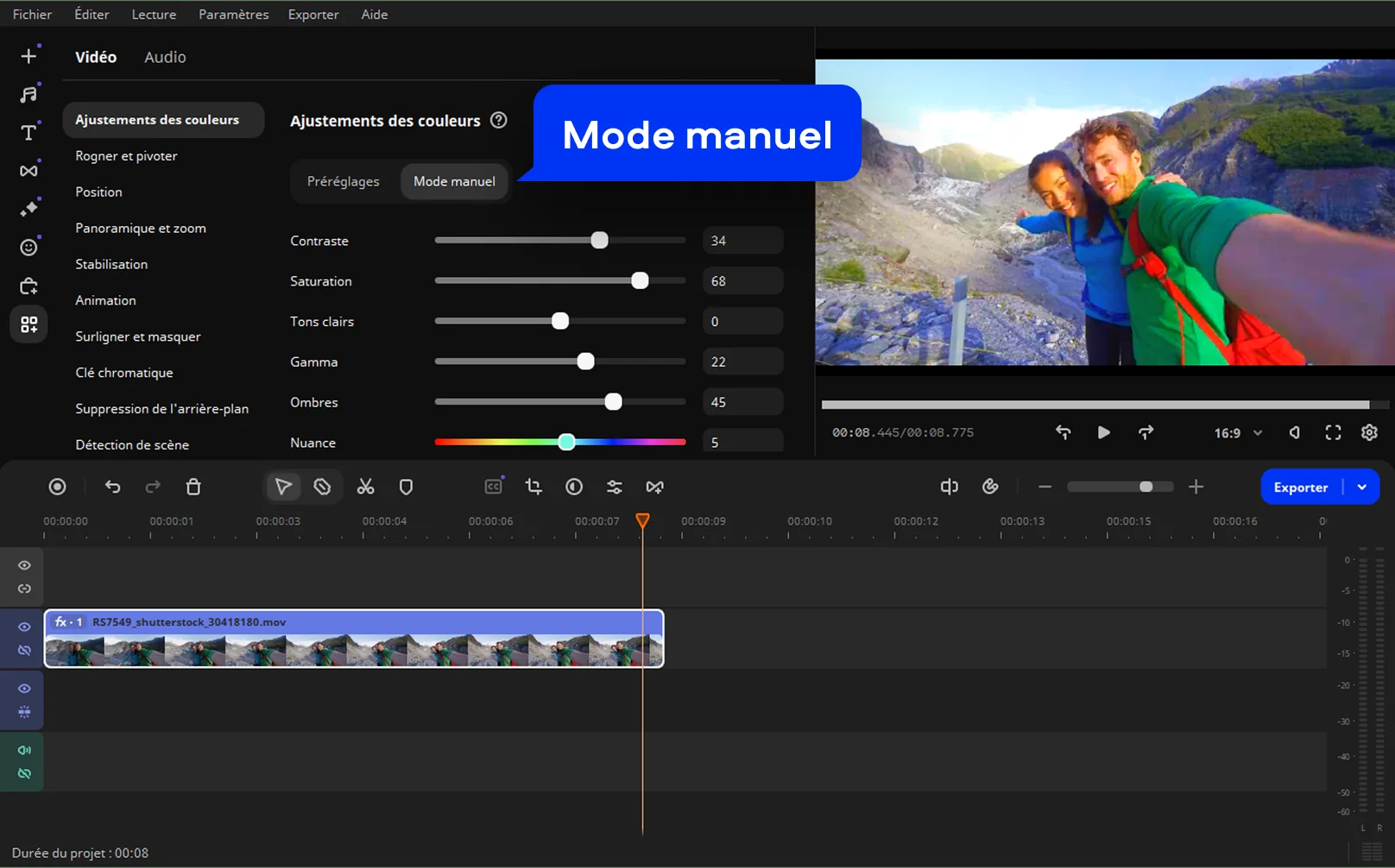 Sélectionnez le clip sur la timeline, puis ouvrez les outils d’amélioration de qualité d'une vidéo en cliquant dans l'onglet Outils, puis Ajustements des couleurs. Activez les options automatiques pour améliorer la qualité d'une vidéo, corriger les couleurs et ajuster la luminosité sans effort.