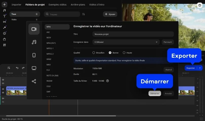 Une fois le montage terminé, cliquez sur Exporter. Choisissez le format et la qualité souhaités, puis enregistrez la vidéo découpée en cliquant sur Démarrer.