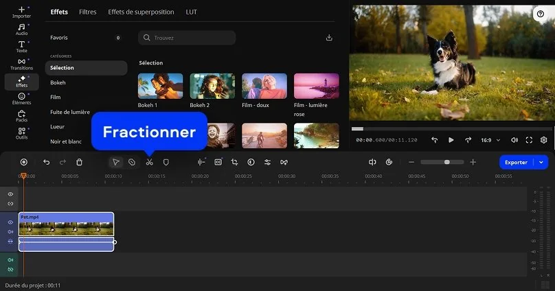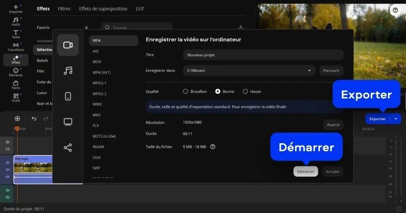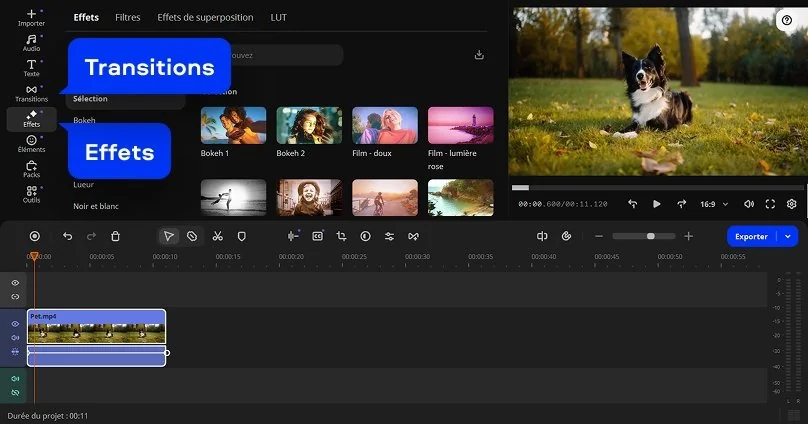 Pour rendre votre vidéo plus dynamique, insérez des transitions et appliquez des filtres ou effets dans l'onglet Effets. Quelques touches suffisent pour un rendu pro.