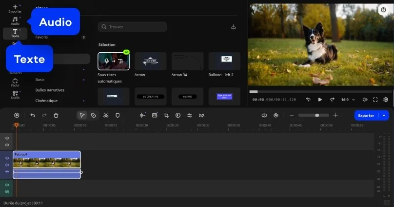 Intégrez une piste musicale adaptée dans l'onglet Audio et ajoutez du texte ou des titres dans l'onglet Texte pour donner du contexte et capter l’attention.