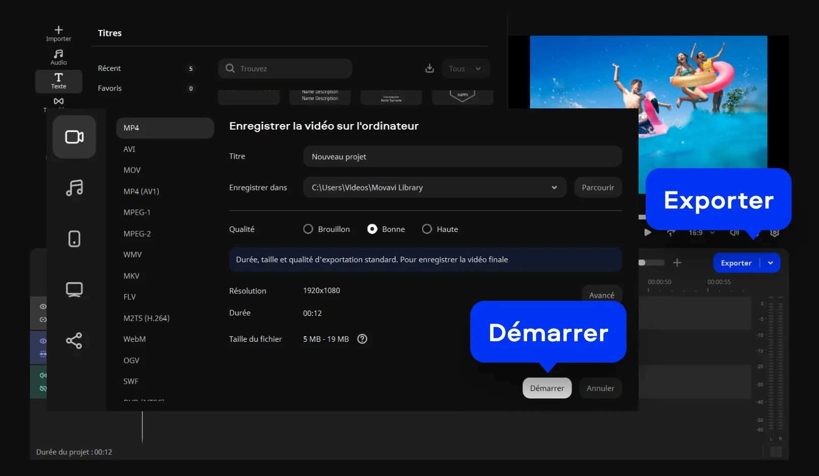 Enfin, cliquez sur le bouton Exporter, choisissez le format souhaité et confirmez la modification en cliquant sur Démarrer. Le logiciel transformera alors votre projet en un film de haute qualité. Ce sera parfait pour projeter des images sur grand écran devant vos proches.
