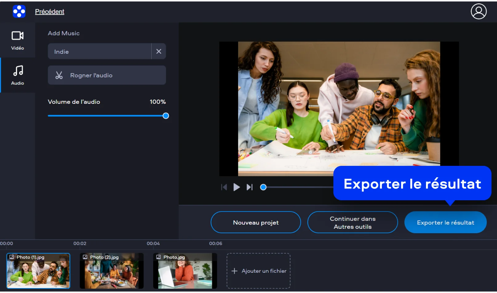 Appuyez sur le bouton Exporter le résultat pour générer votre fichier final, puis téléchargez votre nouveau diaporama directement sur votre disque dur local. Une fois le traitement terminé, votre vidéo est prête à être visionnée sur tous vos écrans ou partagée instantanément.