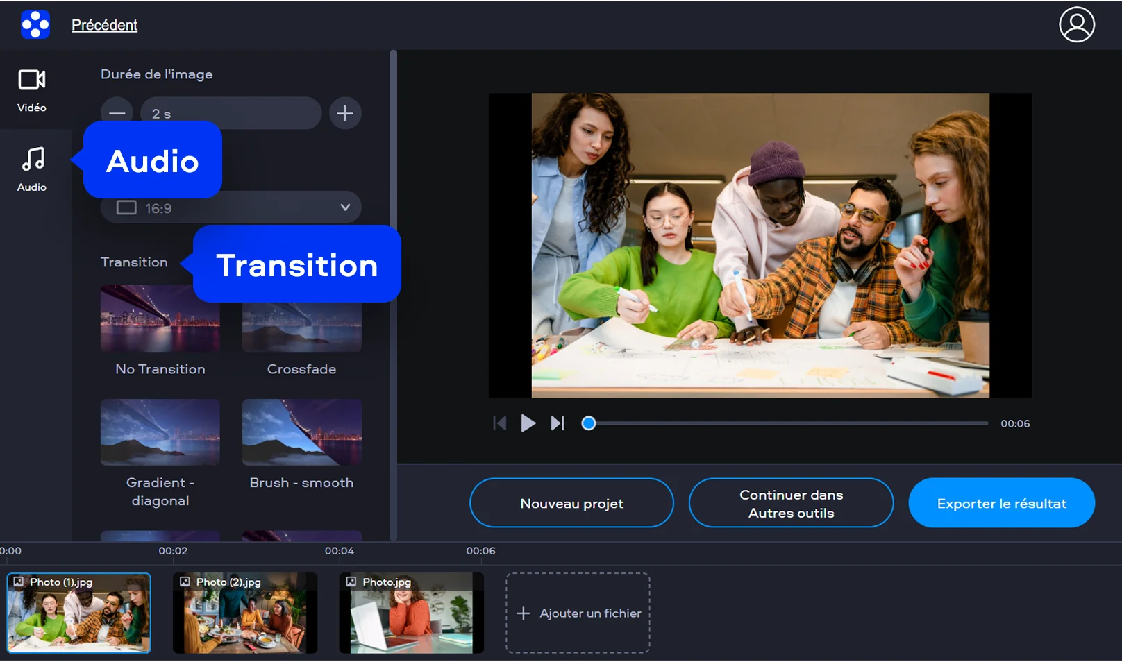 Personnalisez l'ordre des éléments sur la chronologie, ajustez la durée de chaque image, définissez les proportions de votre vidéo, ajoutez des transitions et choisissez une musique de fond pour rythmer votre présentation visuelle. Vous pouvez ainsi ajuster la narration de votre film pour qu'elle corresponde exactement à l'émotion que vous souhaitez transmettre.