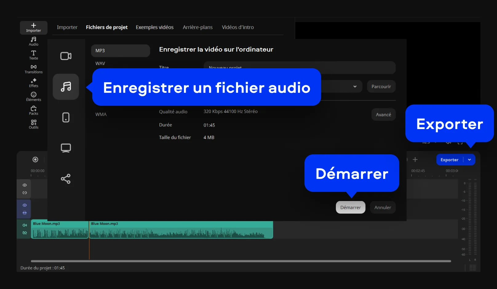 Cliquez sur le bouton Exporter. Dans la fenêtre qui s'ouvre, choisissez l'onglet Enregistrer un fichier audio. Là, indiquez le nom du fichier, sélectionnez le format désiré, le dossier de destination et cliquez sur Démarrer. Vous savez maintenant comment découper un MP3 avec Movavi Video Editor !