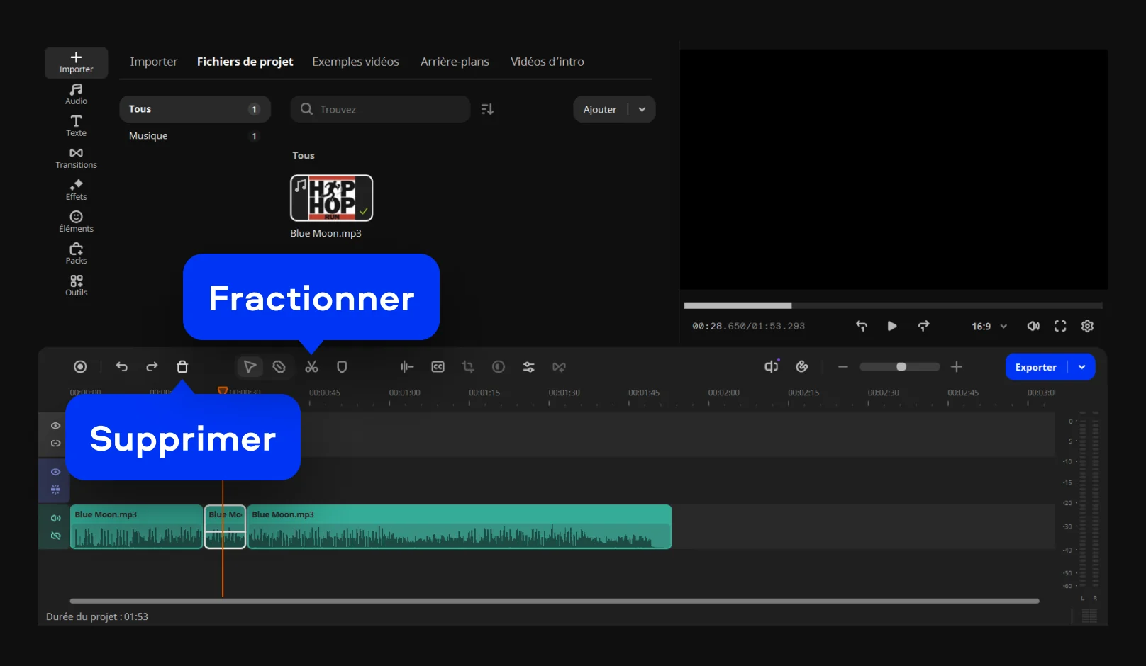 Pour couper un MP3, placez le marqueur rouge à l'endroit souhaité dans la zone de travail et cliquez sur l'icône Fractionner. Vous pouvez découper un audio plusieurs fois s'il faut. Pour supprimer tous les morceaux indésirables, sélectionnez-les et cliquez sur Supprimer. Si vous souhaitez assembler plusieurs segments audio, placez-les l'un après l'autre au début de la piste audio en les faisant glisser.