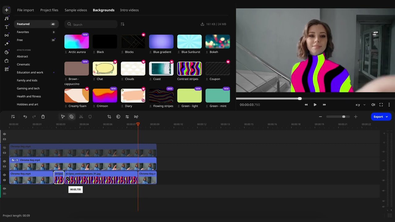 Ajustez les curseurs Tolérance, Opacité, Bords et Bruit pour affiner la suppression et assurer une transition en douceur. Ajoutez votre nouvelle image ou vidéo d'arrière-plan sur une piste ci-dessous, en la redimensionnant ou en la positionnant selon vos besoins.