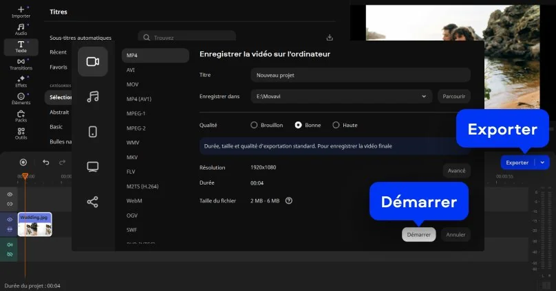 Ce que j’aime vraiment dans Movavi Video Editor, c’est que même sans être un monteur pro, on dispose de tous les outils essentiels (découpage, stabilisation, musique, légendes animées) pour transformer une simple compilation de clips en une vraie histoire d’amour que les mariés et leurs proches auront envie de revoir encore et encore. Une fois que tout est en place et que l’émotion est là, il ne reste plus qu’à exporter votre film de mariage dans le format qui convient à vos écrans ou aux réseaux sociaux.