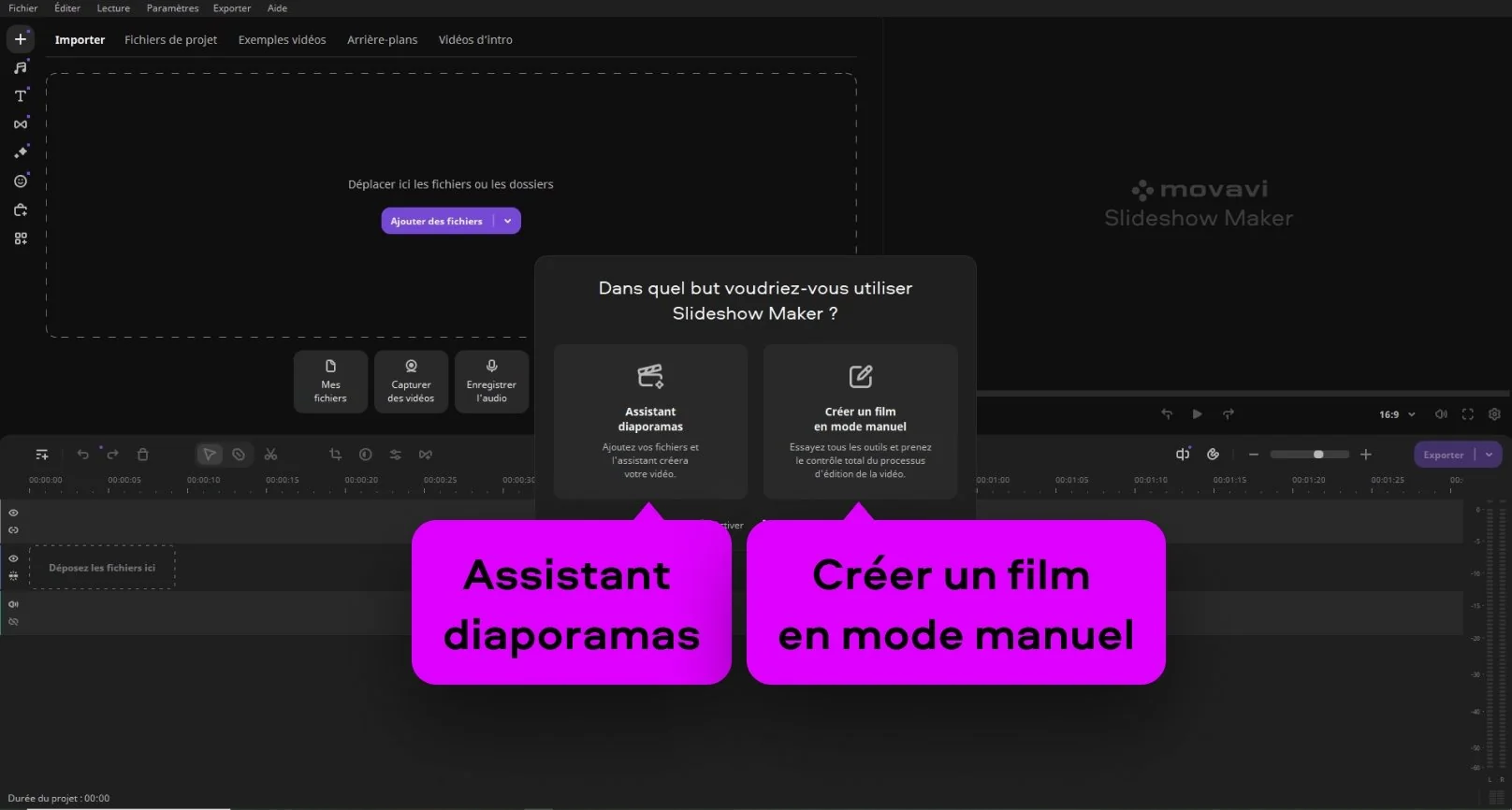 Dans Movavi Slideshow Maker, vous avez deux façons de créer votre vidéo : le mode Assistant et le mode Manuel. Le premier, c’est un peu comme avoir un ami qui s’y connaît et fait le gros du travail pendant que vous sirotez un café. Vous chargez vos photos, choisissez un style, une musique, et le logiciel monte le tout sans que vous ayez à transpirer. Le résultat est souvent bluffant, même si vous n’avez jamais touché un outil de montage.