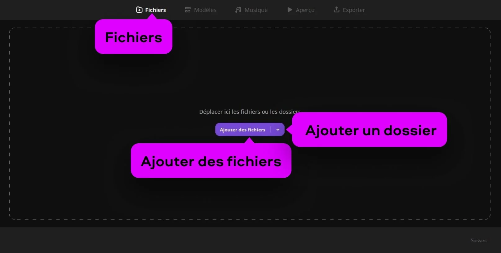 Téléchargez vos fichiers multimédias en cliquant sur Ajouter des fichiers ou Ajouter un dossier dans l'onglet Fichiers, quel que soit le nombre de vos photos et la longueur de vos vidéos. Après avoir téléchargé vos photos dans la zone de travail, vous pouvez facilement les faire glisser et les déposer dans l'ordre approprié.