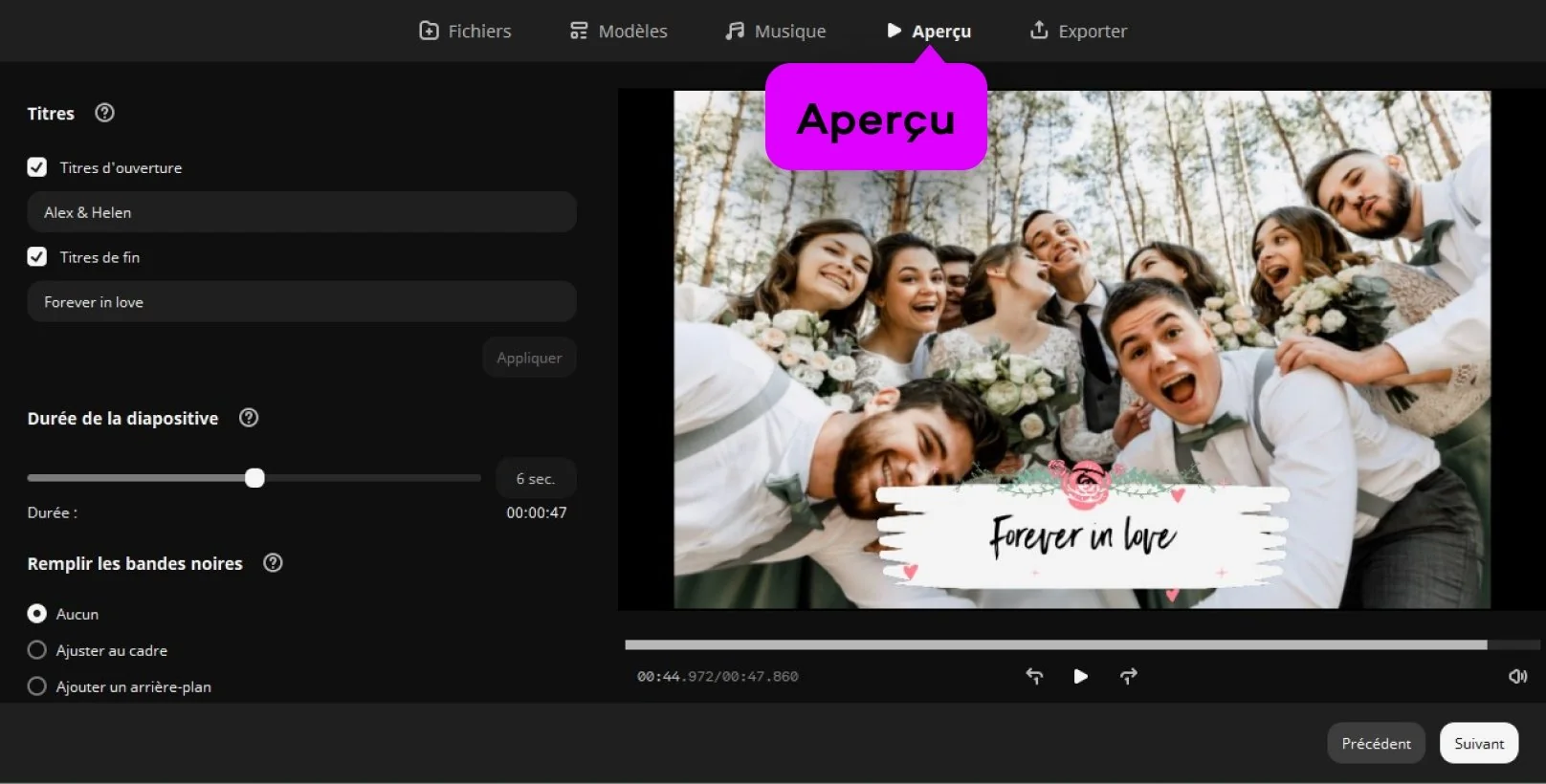 À ce stade, vous pouvez effectuer vos dernières modifications en mode Assistant diaporama. Tapez votre propre texte unique, comme des citations et des souhaits personnels, pour vos titres d'ouverture et de clôture en cliquant sur l'onglet Aperçu, choisissez parmi une variété de styles de légendes. Vous pouvez également ajuster la durée de votre diaporama à celle de la bande sonore et supprimer les barres latérales noires des photos et des vidéos. Prévisualisez votre diaporama de mariage en cliquant sur le bouton Lecture.