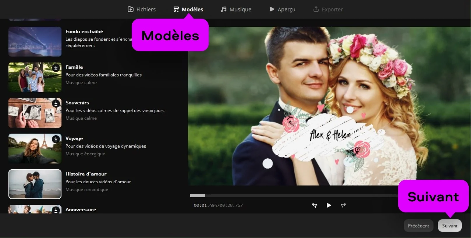 Ce qu’il y a de génial avec Movavi Slideshow Maker, c’est qu’il a déjà tout prévu pour éviter les montages fades. Le programme propose une belle sélection de modèles prêts à l’emploi, du romantique pastel au style cinéma avec musiques grandioses. Certains templates respirent la tendresse, parfaits pour les photos de couple au coucher du soleil. D’autres misent sur les lumières et les transitions énergiques, idéaux pour les moments fous de la fête. Et si vous aimez les choses plus simples, il y a aussi des modèles doux et discrets qui laissent toute la place aux émotions.