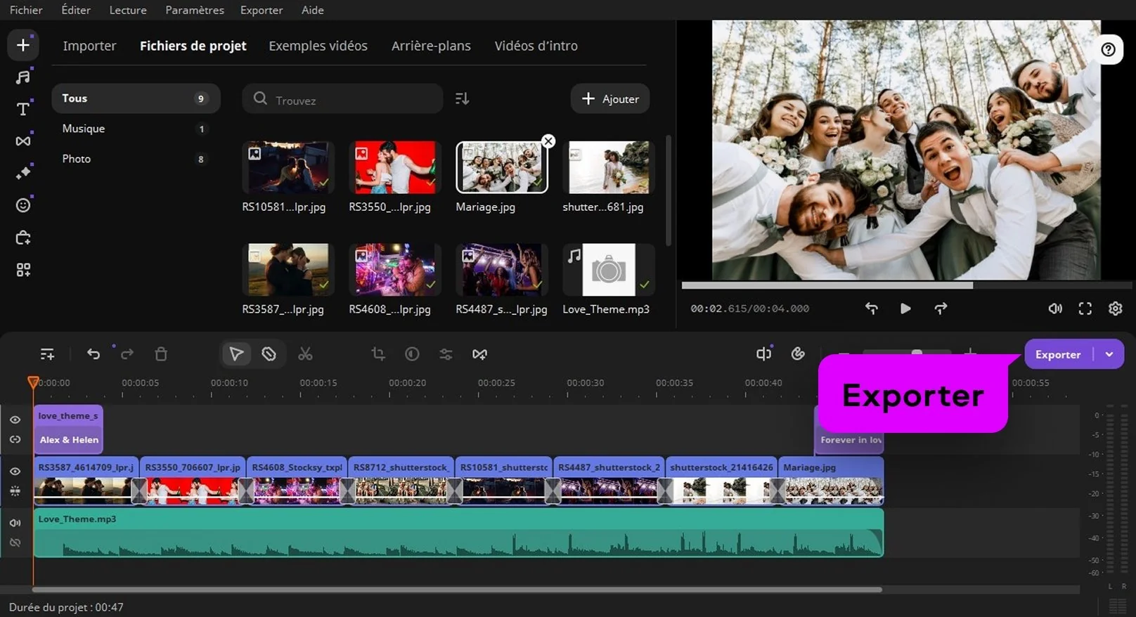 Votre film de photos est presque prêt. Cliquez sur Exporter et passez à l'étape 4 pour enregistrer votre diaporama.