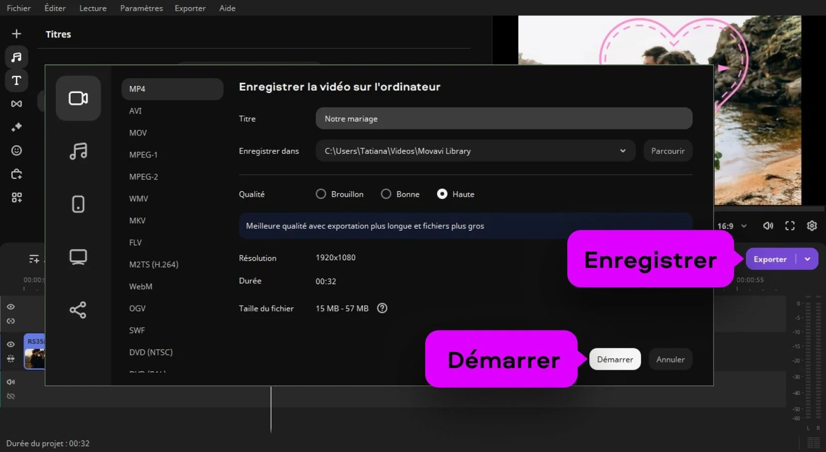 Hourra, votre film de photos de mariage mémorable est presque prêt ! Pour l'enregistrer, ouvrez l'onglet Exporter, cliquez sur Enregistrer la vidéo, puis passez à l'étape 4.