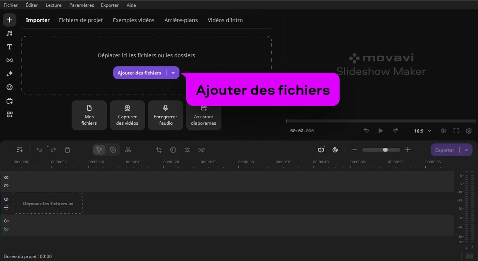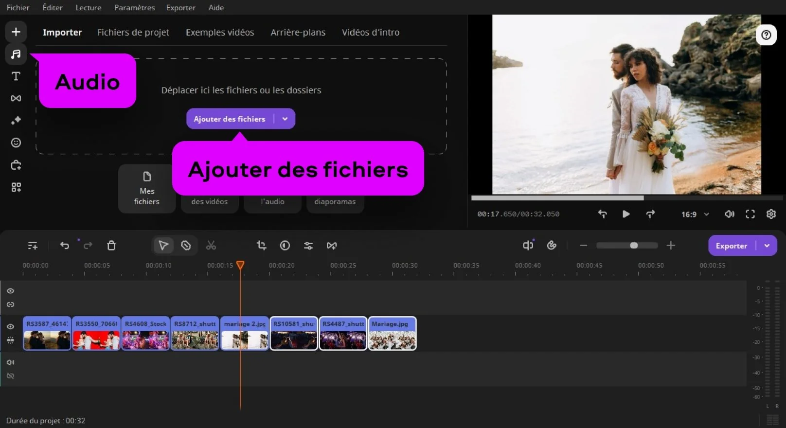Choisissez vos photos et vidéos et ajoutez-les à la chronologie en une seule fois en cliquant sur le bouton Ajouter des fichiers, quel que soit le nombre de photos et la longueur de vos vidéos.