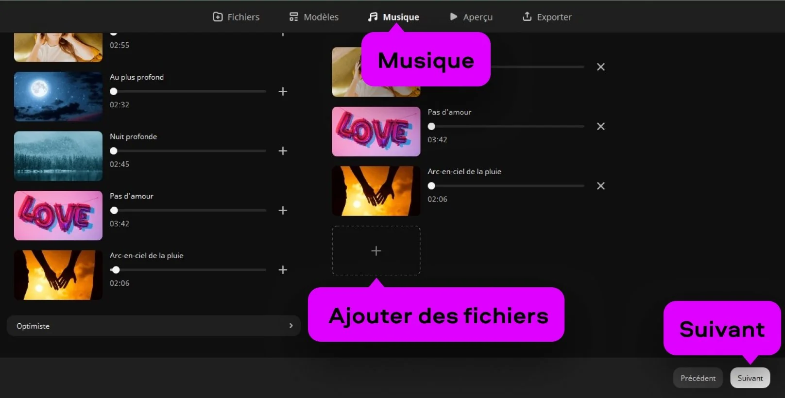 Ajoutez de la musique à votre film de réception de mariage. Vous pouvez faire glisser et déposer vos fichiers musicaux dans la zone de travail, ou cliquer sur Ajouter des fichiers dans l'onglet Musique pour les choisir et les importer. Ajoutez une chanson qui a une signification particulière pour le couple ou faites votre choix dans la bibliothèque musicale qui propose un large éventail de morceaux de musique prêts à l'emploi.
