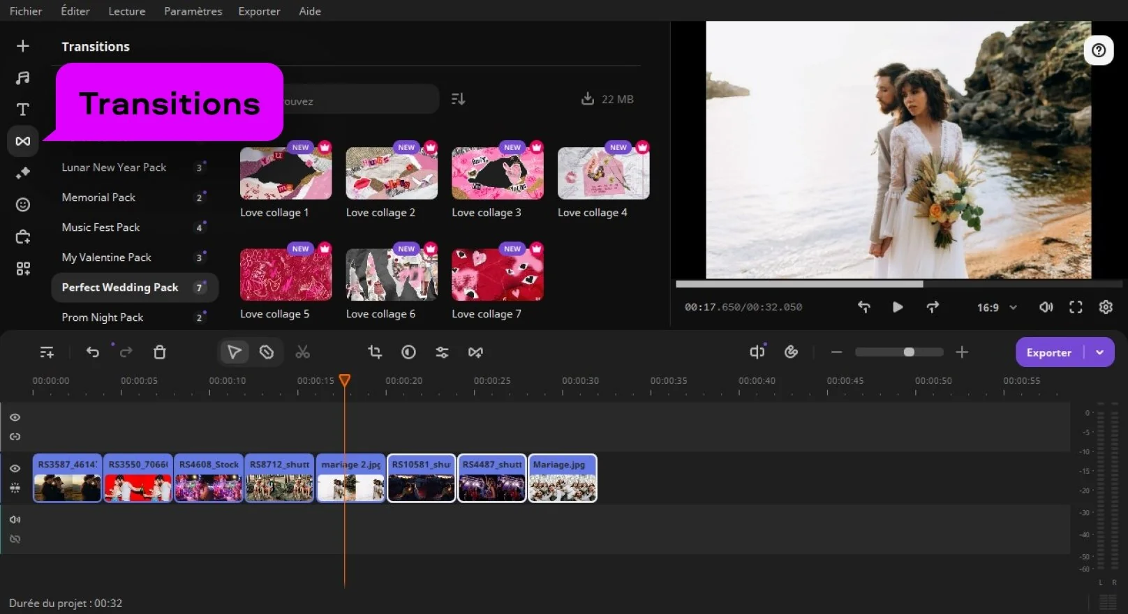 Rendez votre film fluide - allez dans l'onglet Transitions, choisissez parmi les catégories thématiques et sélectionnez les transitions que vous préférez.