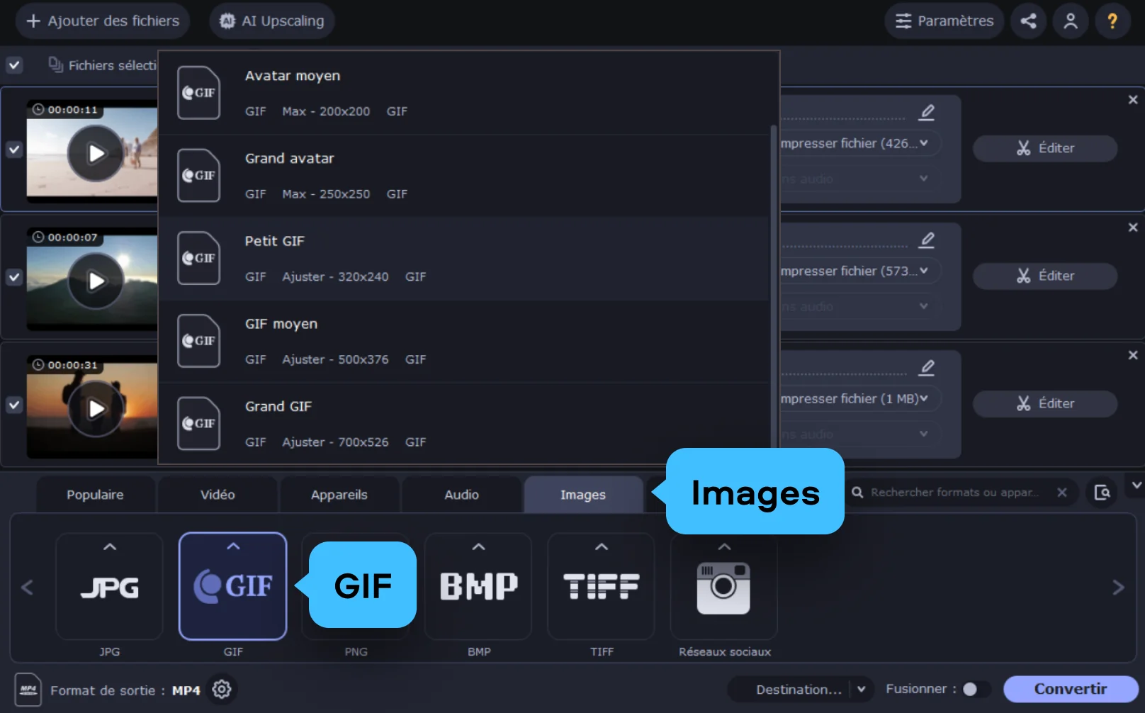 Pour réduire un GIF, cliquez Images dans le menu d’en bas, ouvrez GIF et sélectionnez une des résolutions proposées, moins volumineuses que celle de votre fichier initial.