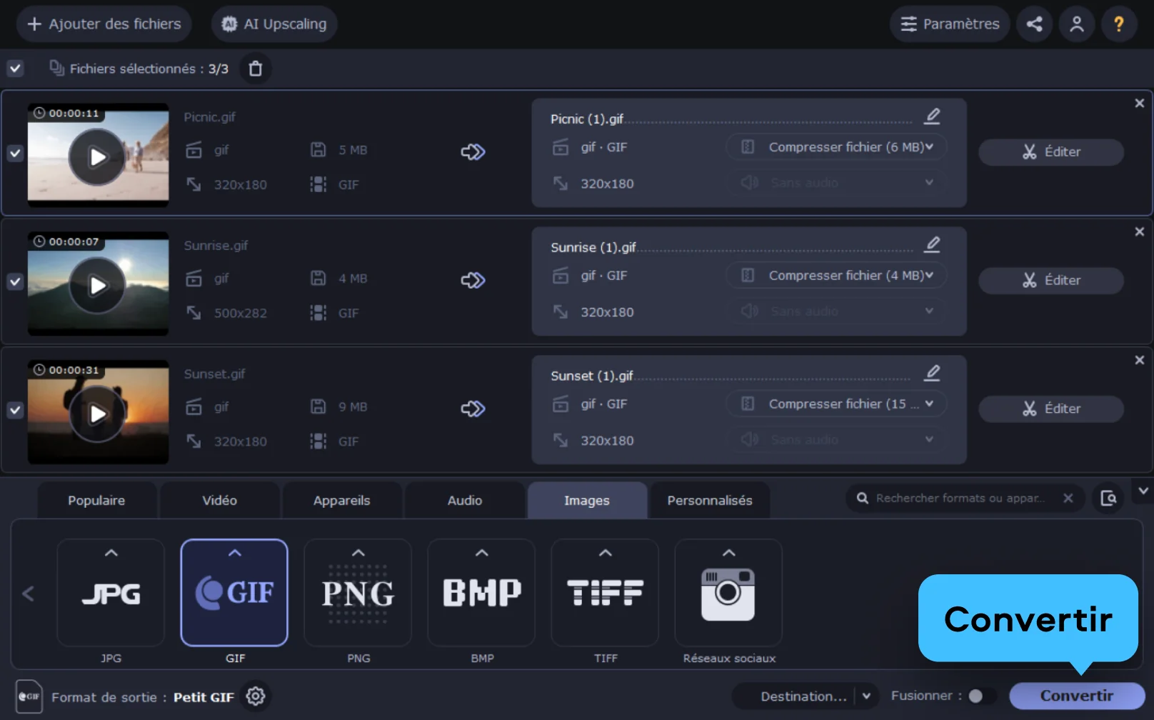 Choisissez le dossier de destination, puis cliquez sur Convertir. Une fois le processus terminé, récupérez votre GIF compressé, prêt à être utilisé.