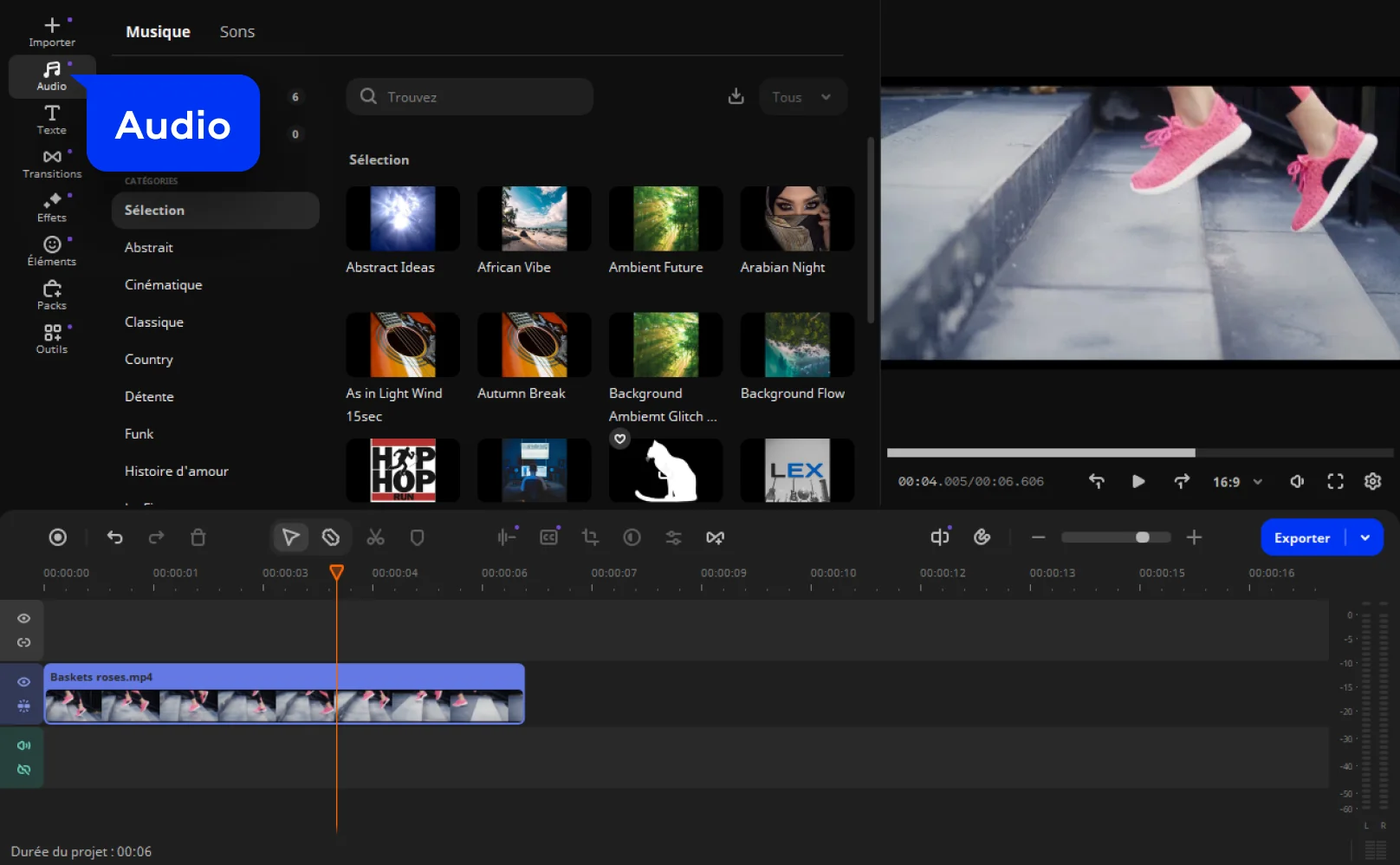 Si vous souhaitez utiliser une nouvelle musique ou une voix off, importez le fichier audio et faites-le glisser sur la piste audio, ou choisissez une des mélodies intégrées dans l’onglet Audio.