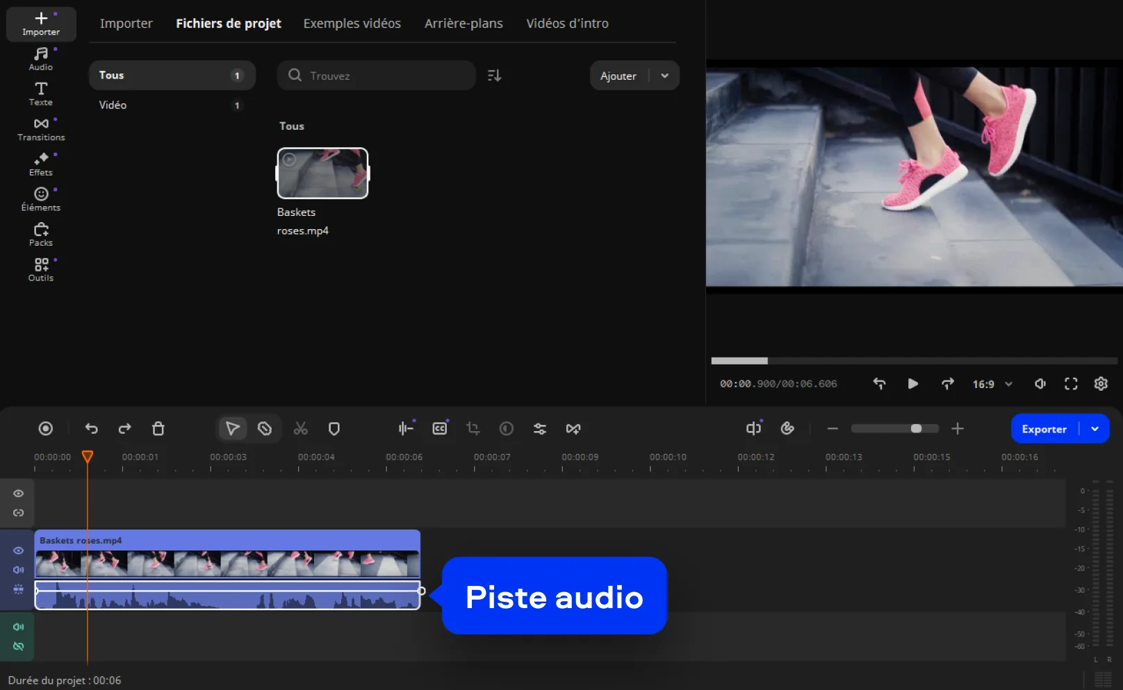 Pour couper le son d'une vidéo, sélectionnez le clip sur la timeline, puis cliquez sur la piste audio d'origine dans la timeline et appuyez sur la touche Suppr. La piste audio sera immédiatement supprimée, tandis que la vidéo restera inchangée.