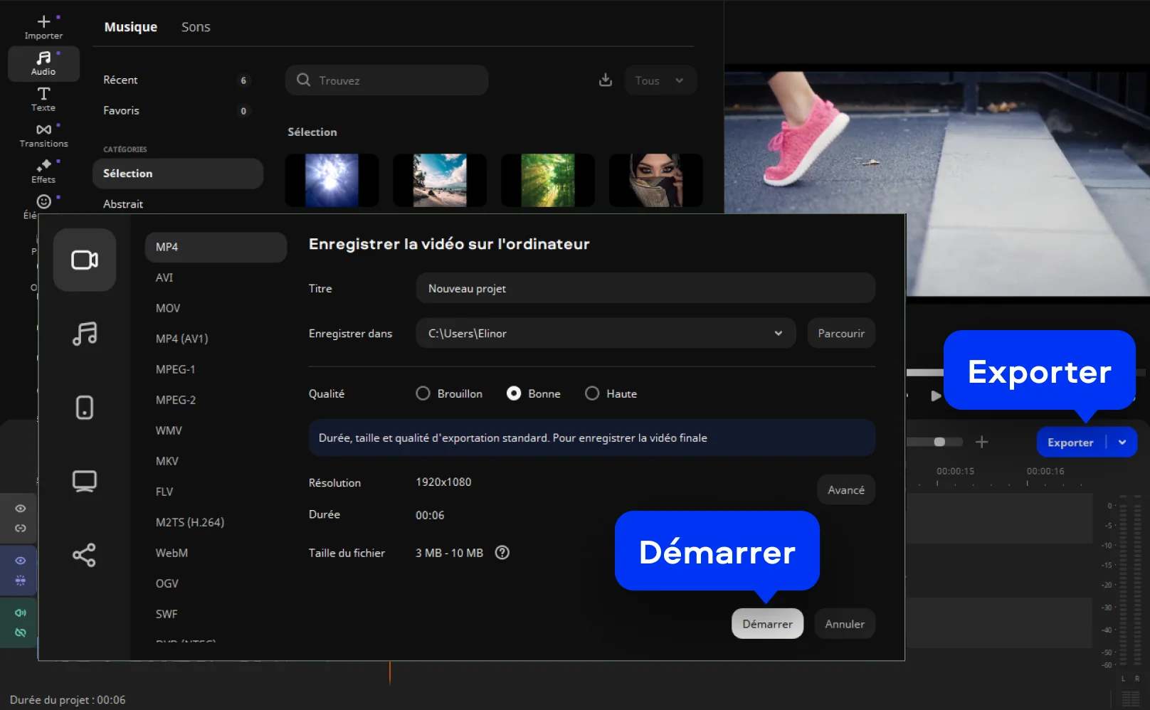 Cliquez sur Exporter, choisissez le format et les paramètres souhaités, puis enregistrez la vidéo finale en cliquant sur Démarrer. Le fichier est exporté sans audio ou avec un son remplacé.