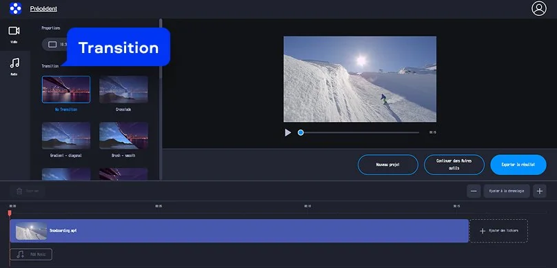 Pour que la vidéo « respire », ajoutez une transition quand vous changez de scène : dans le panneau Transition, vous pouvez laisser No Transition pour un style punchy, ou choisir un fondu type Crossfade pour une liaison plus douce. Ajustez l’ordre des plans, synchronisez la musique, et pensez à garder un rythme confortable – YouTube récompense les vidéos qui vont droit au but.