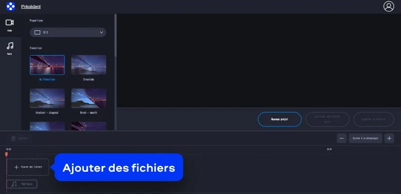 Ouvrez Movavi en ligne et cliquez sur le bouton Ajouter des fichiers. Sélectionnez le fichier depuis votre appareil. Petit réflexe utile pour YouTube : gardez un format 16:9 afin d’éviter les recadrages surprise.
