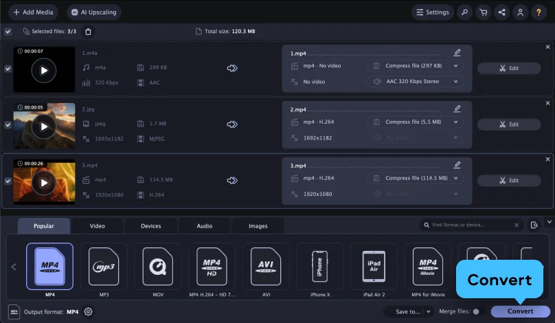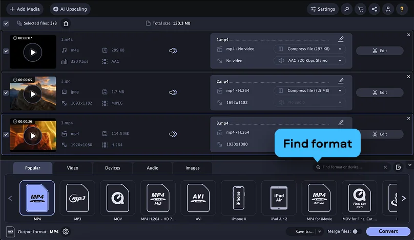 Now you know how to change the file format using the Movavi converter. With this tool, you can also reduce the file size, cut out clips from videos, crop pictures, and create animations from your favorite movies. Get the free trial version and test it out!