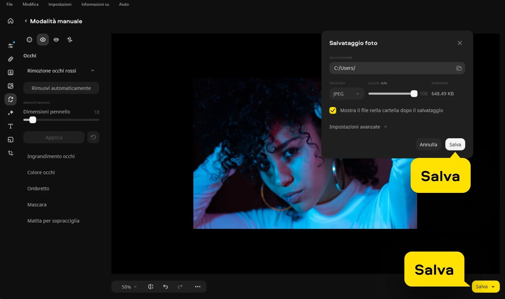 Quando siete soddisfatti del risultato, cliccate su Salva. Scegliete la qualità e il formato desiderato, e godetevi la vostra immagine senza occhi rossi, pronta da condividere o stampare.