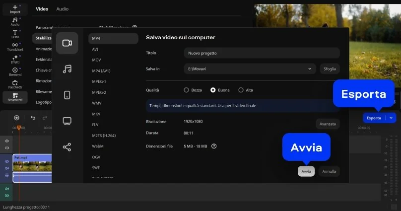 Scegliete il formato che preferite, come MP4 o MOV, e cliccate su Esporta. In pochi istanti avrete un video fluido e pronto da condividere. Questo è tutto per la domanda "Come stabilizzare un video?"
