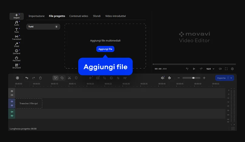 Fai clic su Aggiungi file e seleziona il tuo video. Quindi trascina e rilascia il file sulla timeline.