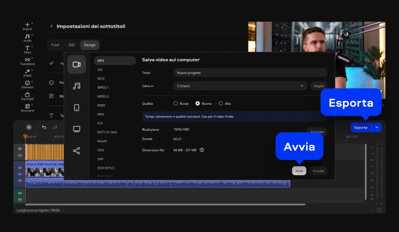 Perfetto! Ora è il momento di salvare il video. Clicca sul pulsante Esporta, regola le impostazioni di output e fai clic su Avvia.