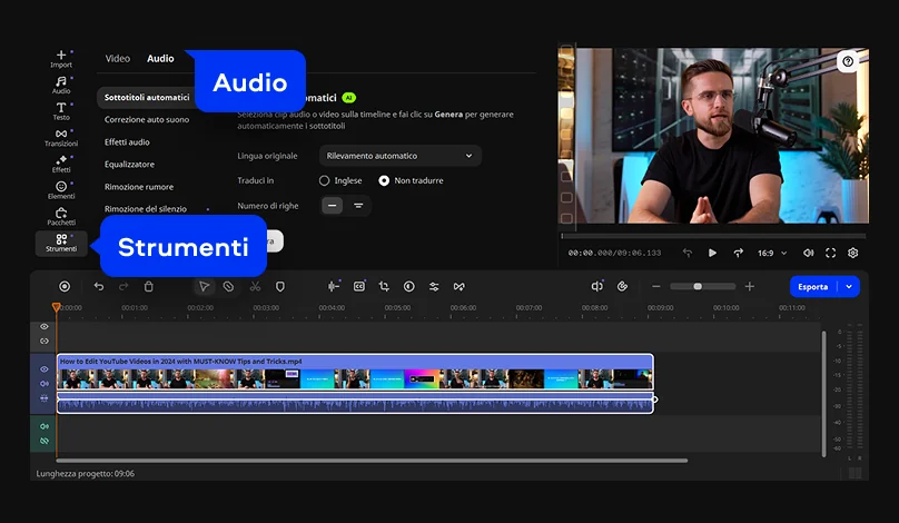 Strumenti IA con un clic: sottotitoli automatici, rimozione del rumore e altro