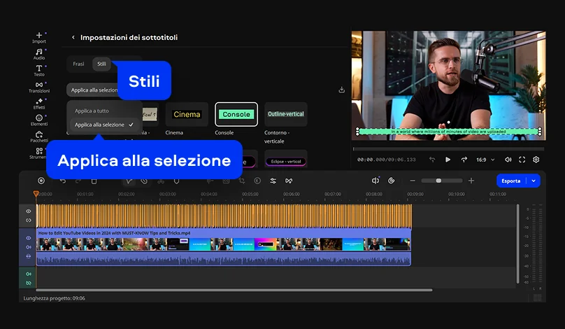 Apri la scheda Stili e seleziona il design per i tuoi sottotitoli. Sono disponibili oltre 30 stili per adattarsi perfettamente a qualsiasi tipo di contenuto video che crei. Il design selezionato verrà applicato a tutte le clip per impostazione predefinita. Se desideri impostare stili diversi per alcune clip, seleziona la clip sulla timeline e scegli Applica alla selezione dal menu a discesa.
