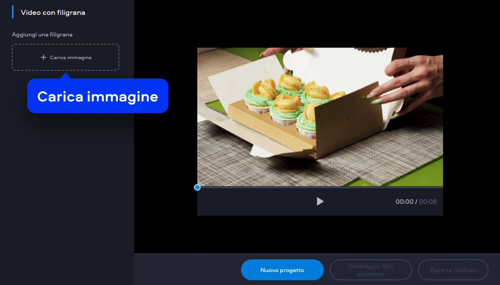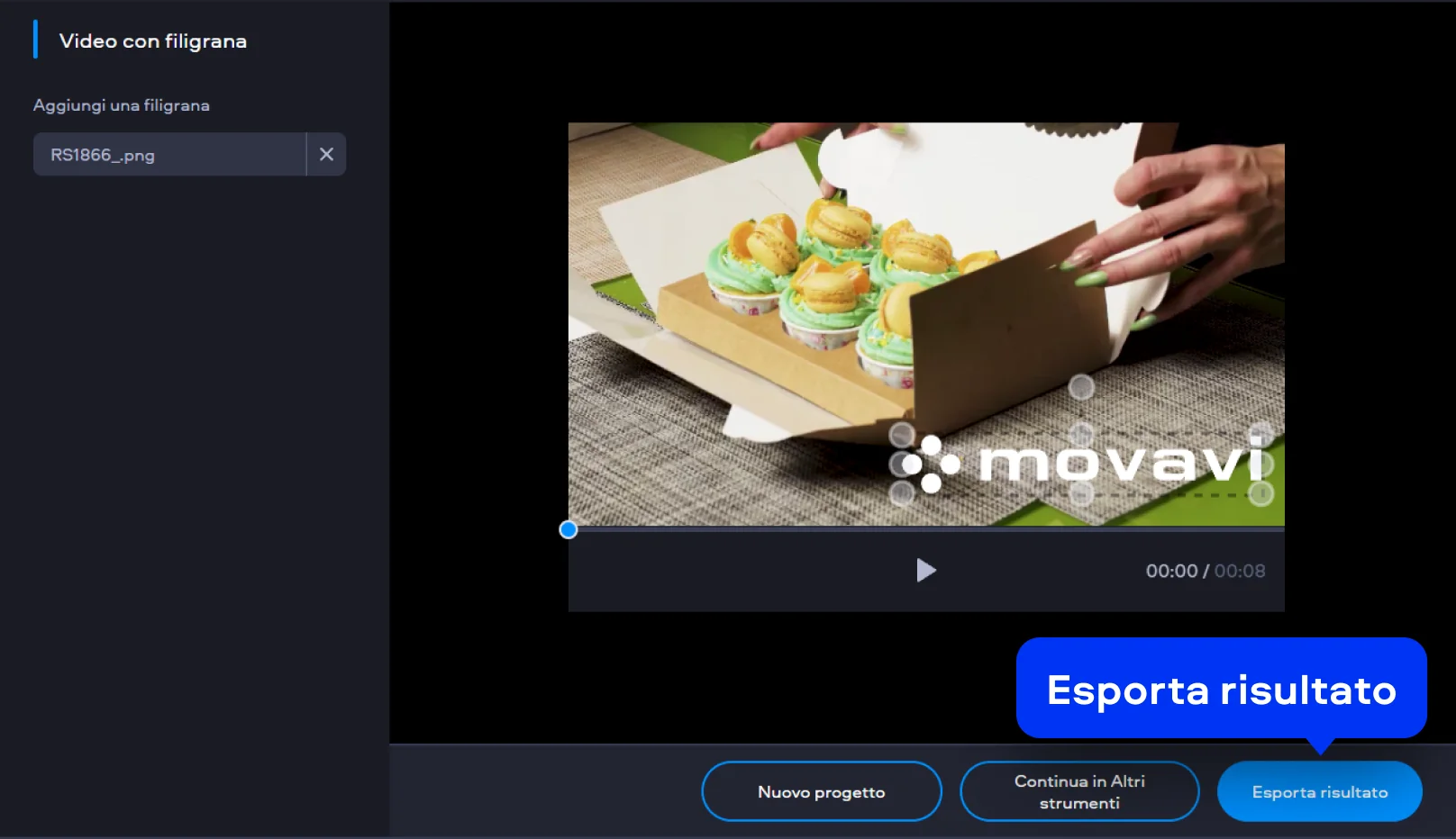 Quando sei soddisfatto del risultato finale, clicca su Esporta risultato. Il video viene elaborato online e salvato con la filigrana applicata, pronto per la pubblicazione o la condivisione.