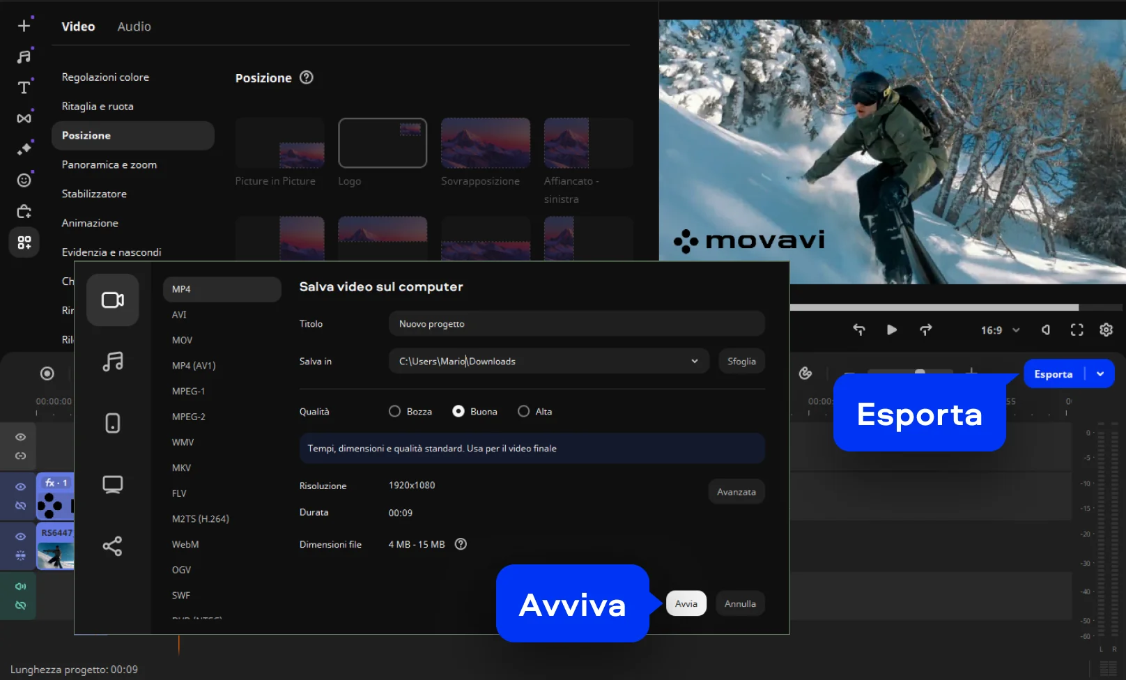 Quando il lavoro si fa più serio e serve controllo totale su logo, tempi e posizionamento, io passo senza esitazioni a Movavi Video Editor. È un software desktop solido, intuitivo, e ti dà la sensazione di avere il montaggio davvero in mano, senza complicazioni inutili.