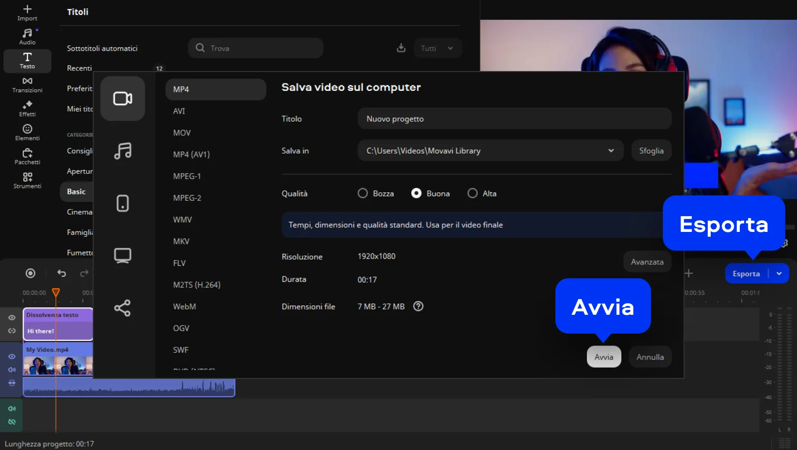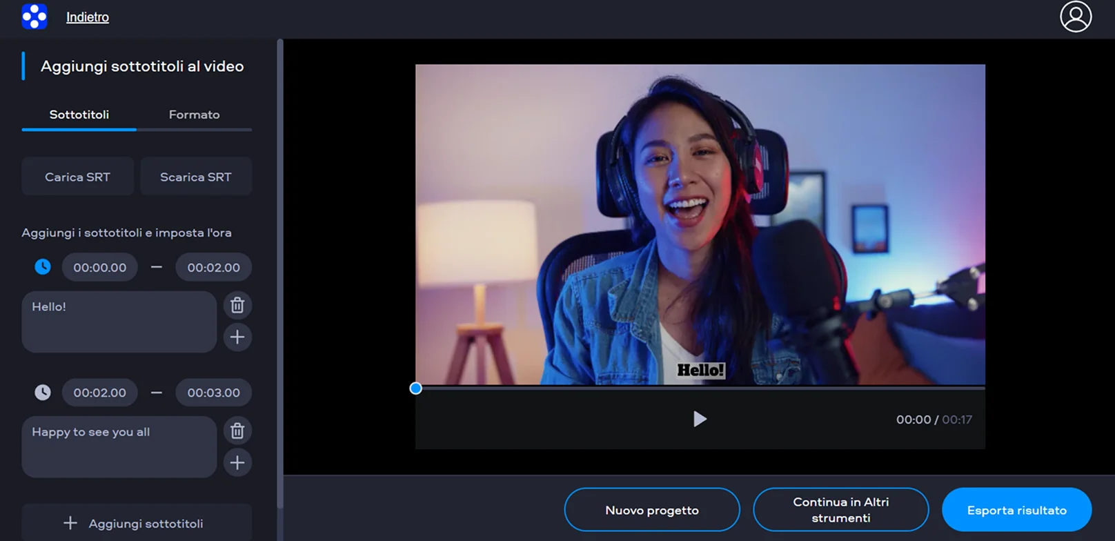 Lo strumento online di Movavi permette di aggiungere sottotitoli a un video online gratis direttamente dal browser. L’interfaccia è semplice e intuitiva, compatibile con i formati più comuni come MP4, e consente di caricare il file, inserire il testo e salvare il video finale in pochi minuti.