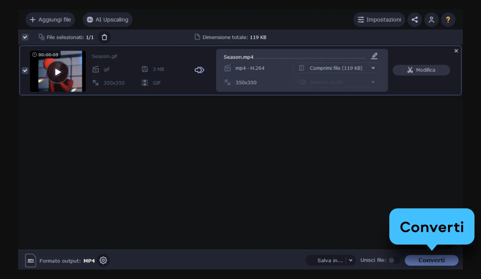 Comprimi una GIF: scegli la cartella di destinazione, poi clicca su Converti. In pochi istanti avrai una GIF più leggera, pronta per essere condivisa senza messaggi di errore o limiti di upload.