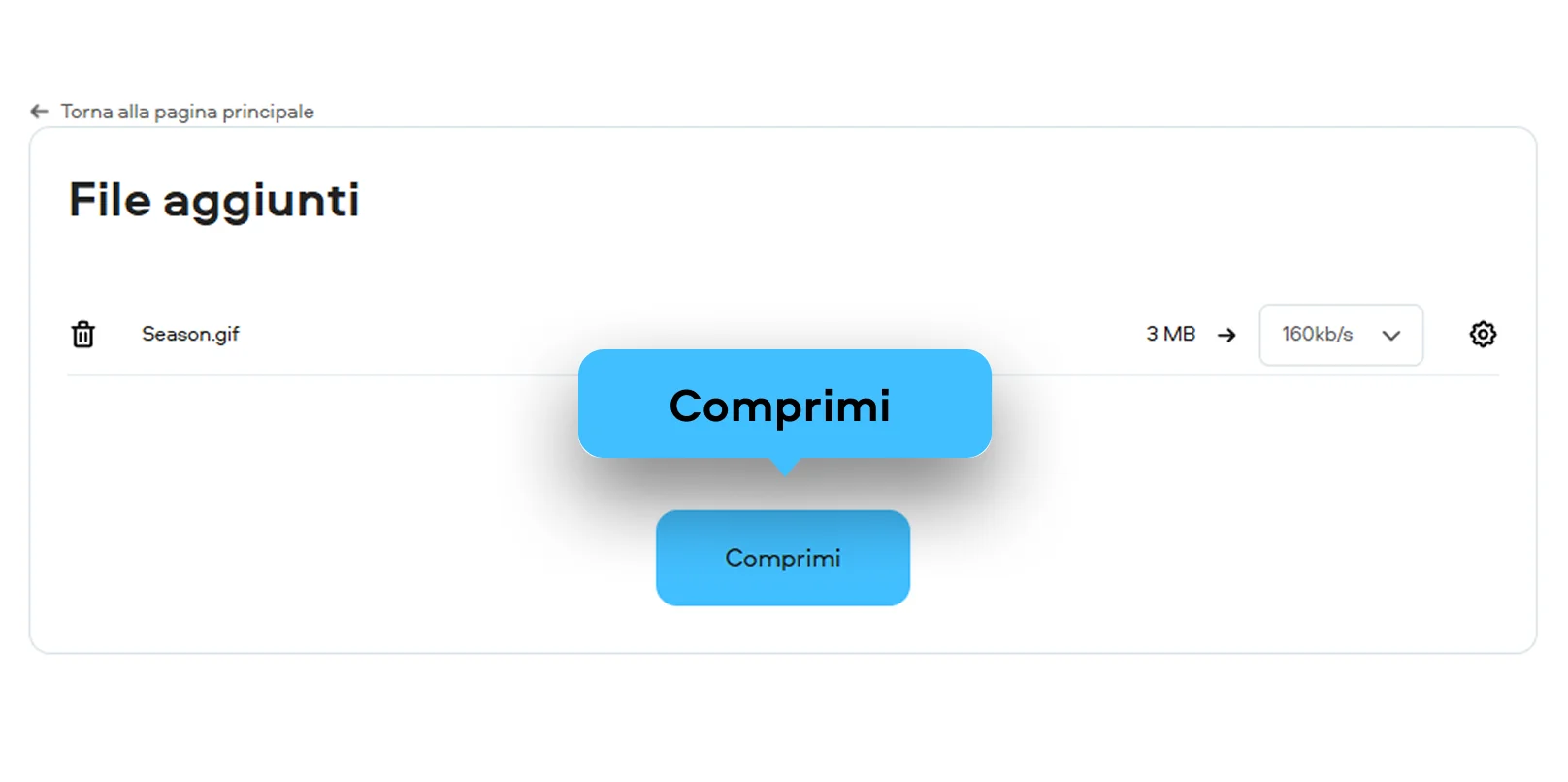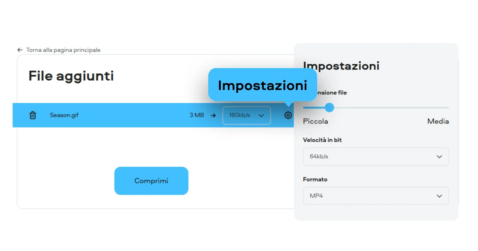 Scegli il livello di compressione: modifica le impostazioni come la velocità in bit e la dimensione file per comprimere GIF. Qui puoi anche scegliere un altro formato di file.