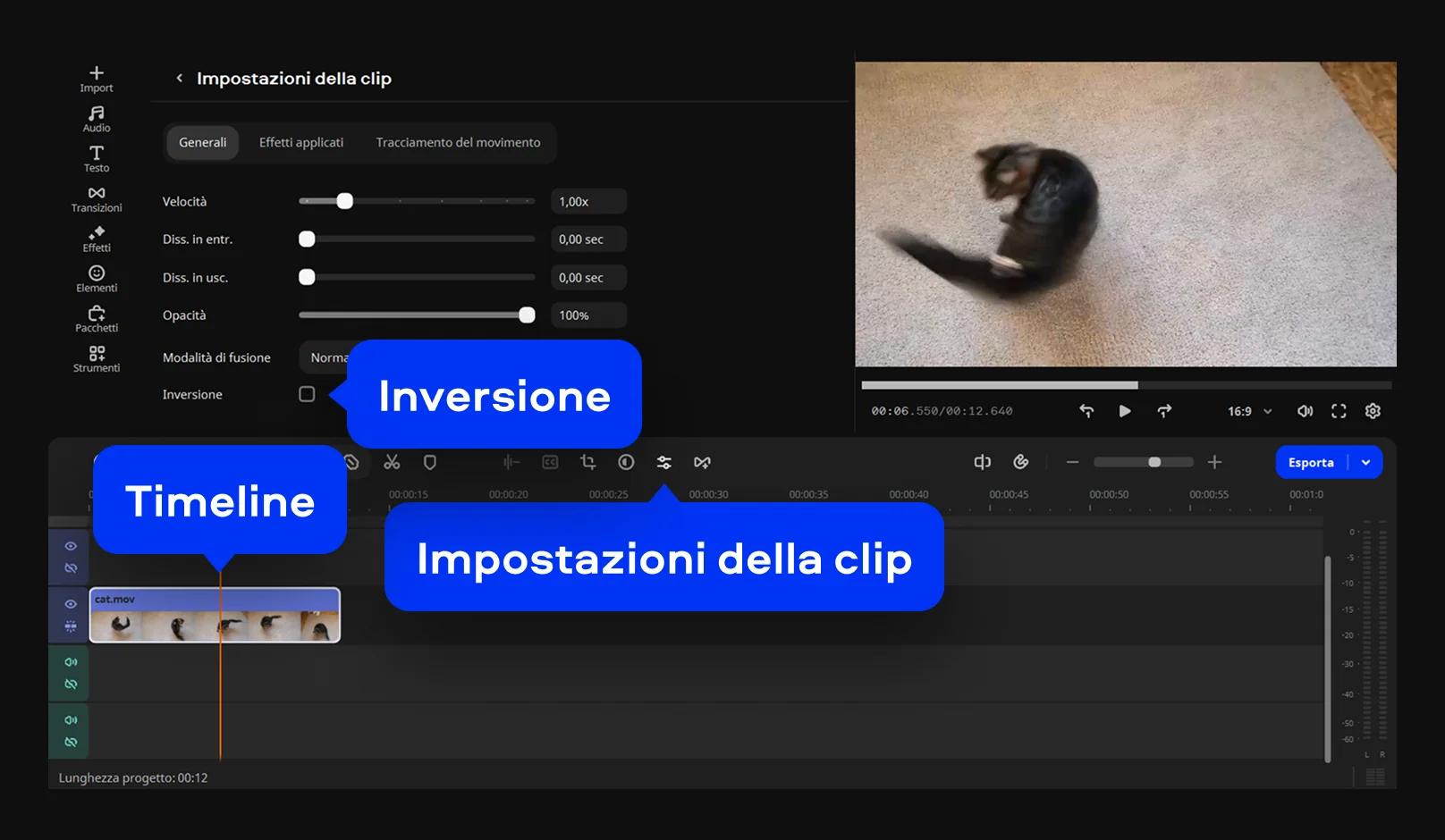 Seleziona il file sulla Timeline e clicca sull'icona Impostazioni della clip. Si aprirà una scheda: spunta la casella Inversione per invertire un video.
