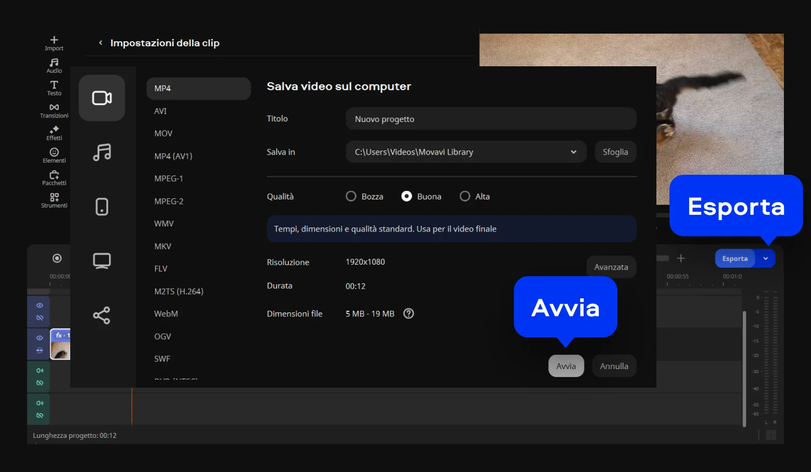 *La versione gratuita di Movavi Video Editor potrebbe avere le seguenti restrizioni a seconda della build: filigrana sulle clip esportate, limite di lunghezza video di 60 secondi o metà audio e/o alcune funzionalità avanzate non disponibili durante l'esportazione dei video.