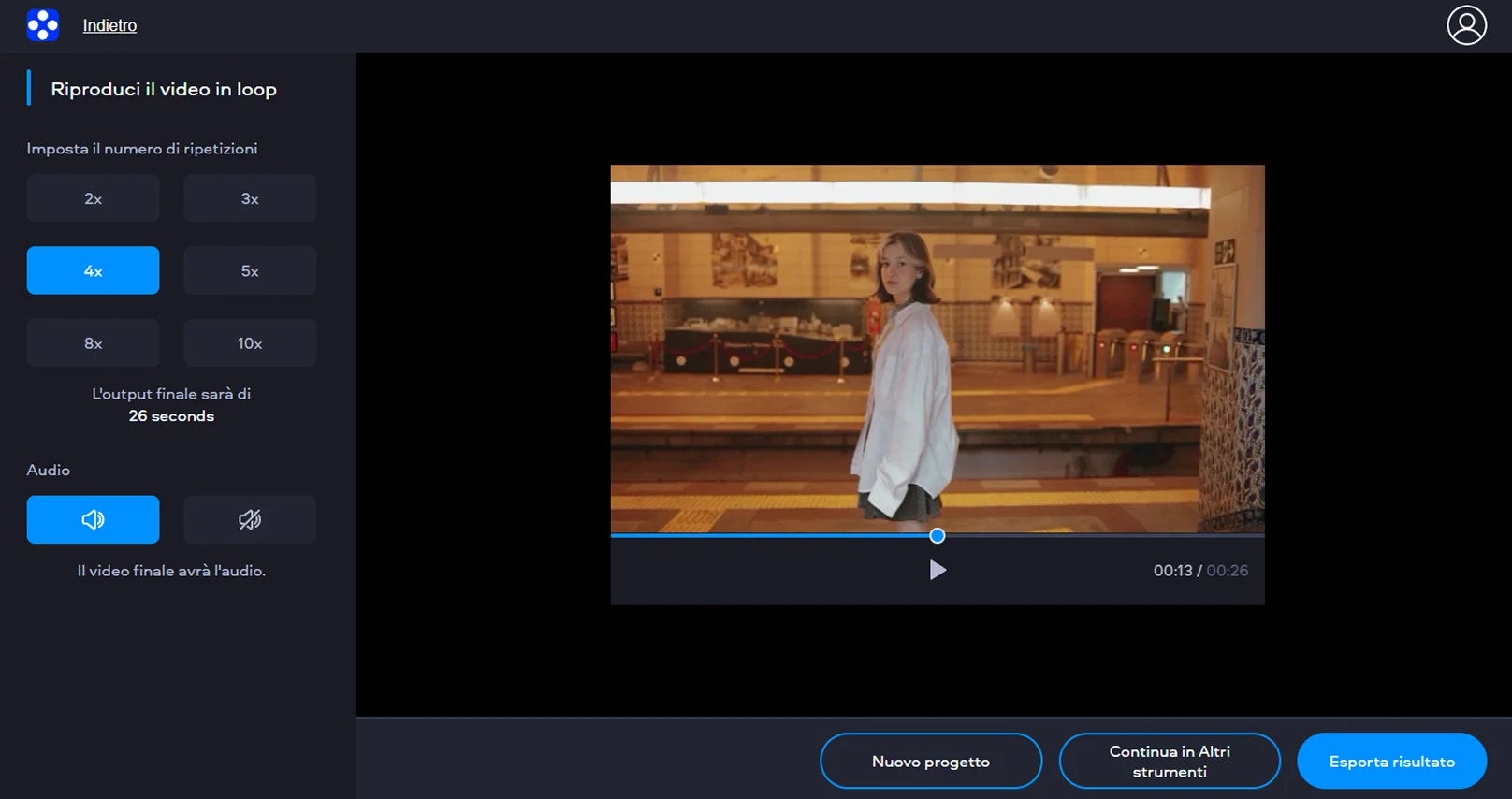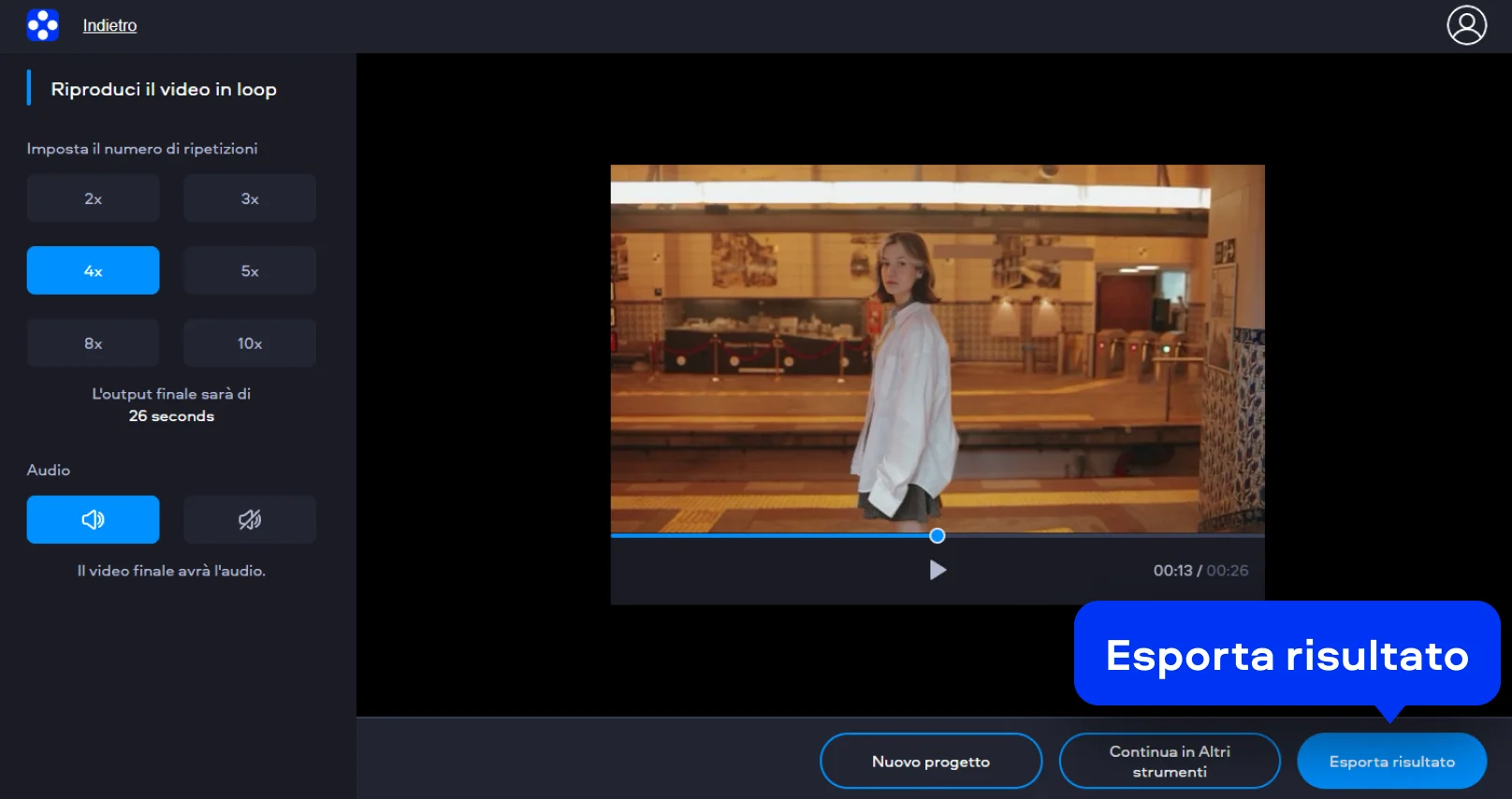 Una volta importato, potete scegliere l’opzione per creare un loop continuo. Questo è il metodo più diretto per chi cerca come mettere un video in loop, online, senza interventi manuali sulla timeline.