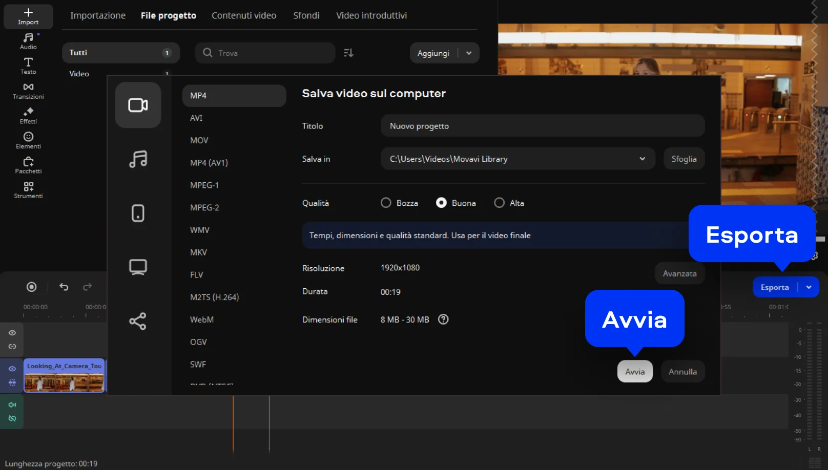 Per chi desidera un controllo maggiore sul montaggio, Movavi Video Editor rappresenta la soluzione desktop più completa. È un programma pensato per utenti che vogliono creare loop precisi, lavorare su progetti più lunghi o combinare clip con audio e transizioni.